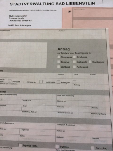 Auf fast allen Friedhöfen muss ein Antrag zur Aufstellung eines Grabmals eingereicht werden. Es gehört zu unserem Service, diese Formalitäten für Sie zu erledigen.