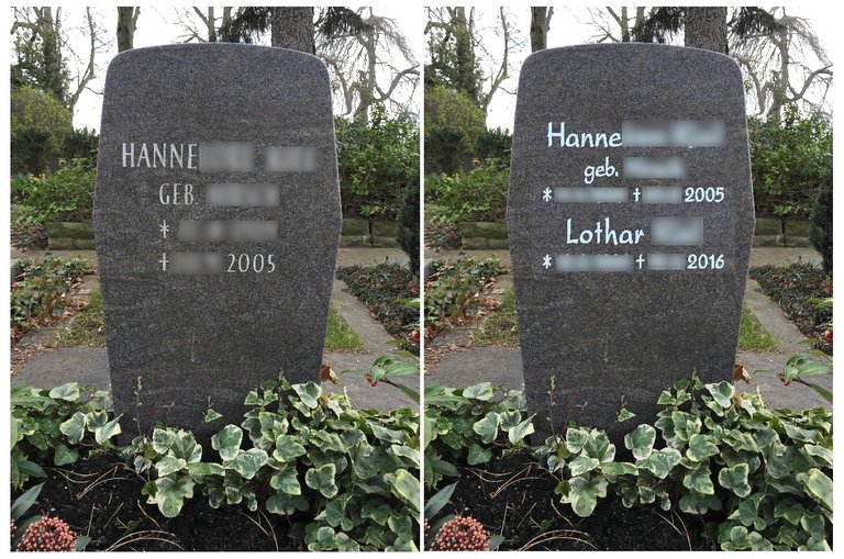 Dazu demontieren wir das Denkmal auf dem Friedhof, passen die zweite Beschriftung an die existierenden Grabsteinbuchstaben an und stellen es fachgerecht auf.